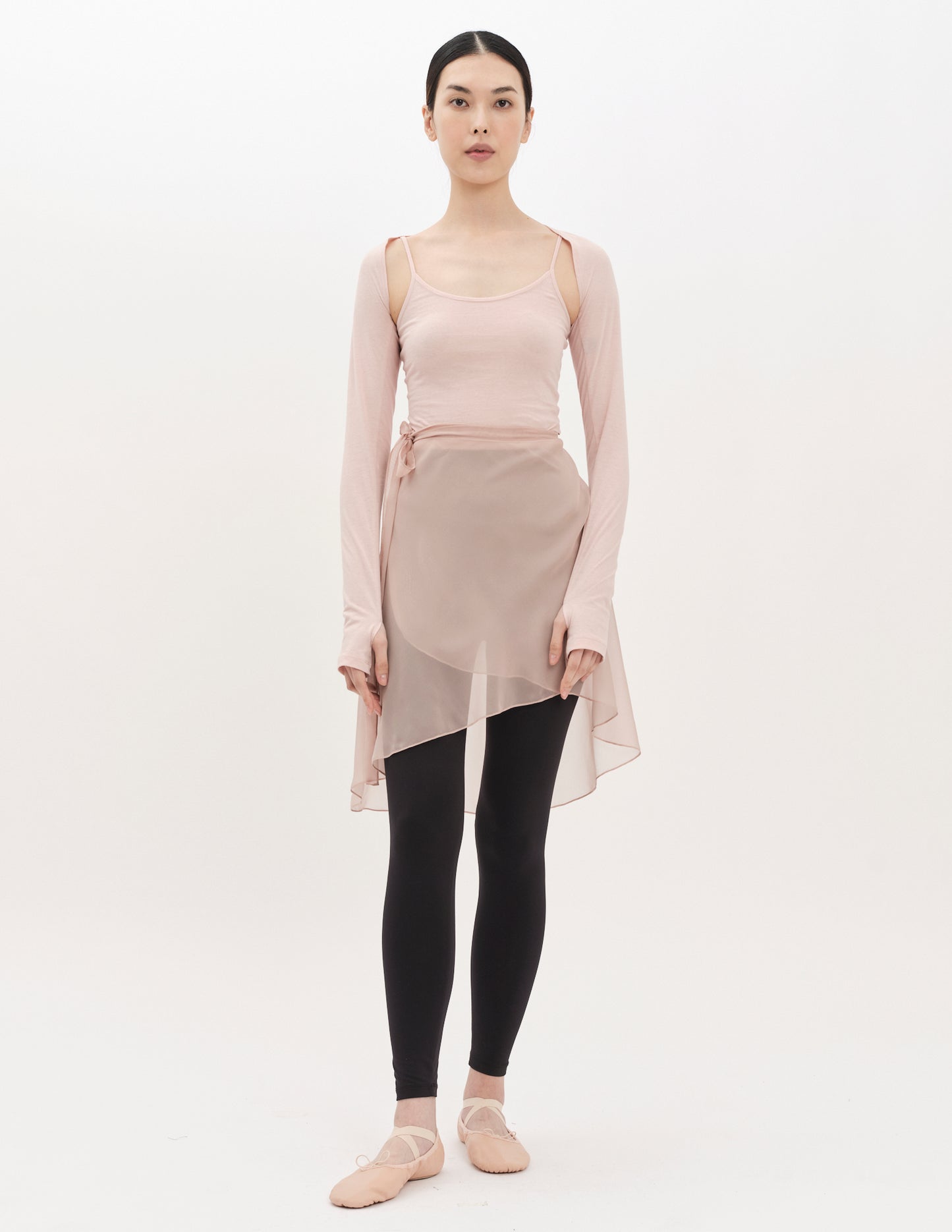 two-piece set with scoop neck tank top and long sleeve bolero with thumb holes in bamboo and cotton jersey. styled with the darcy leggings and violette wrap skirt.